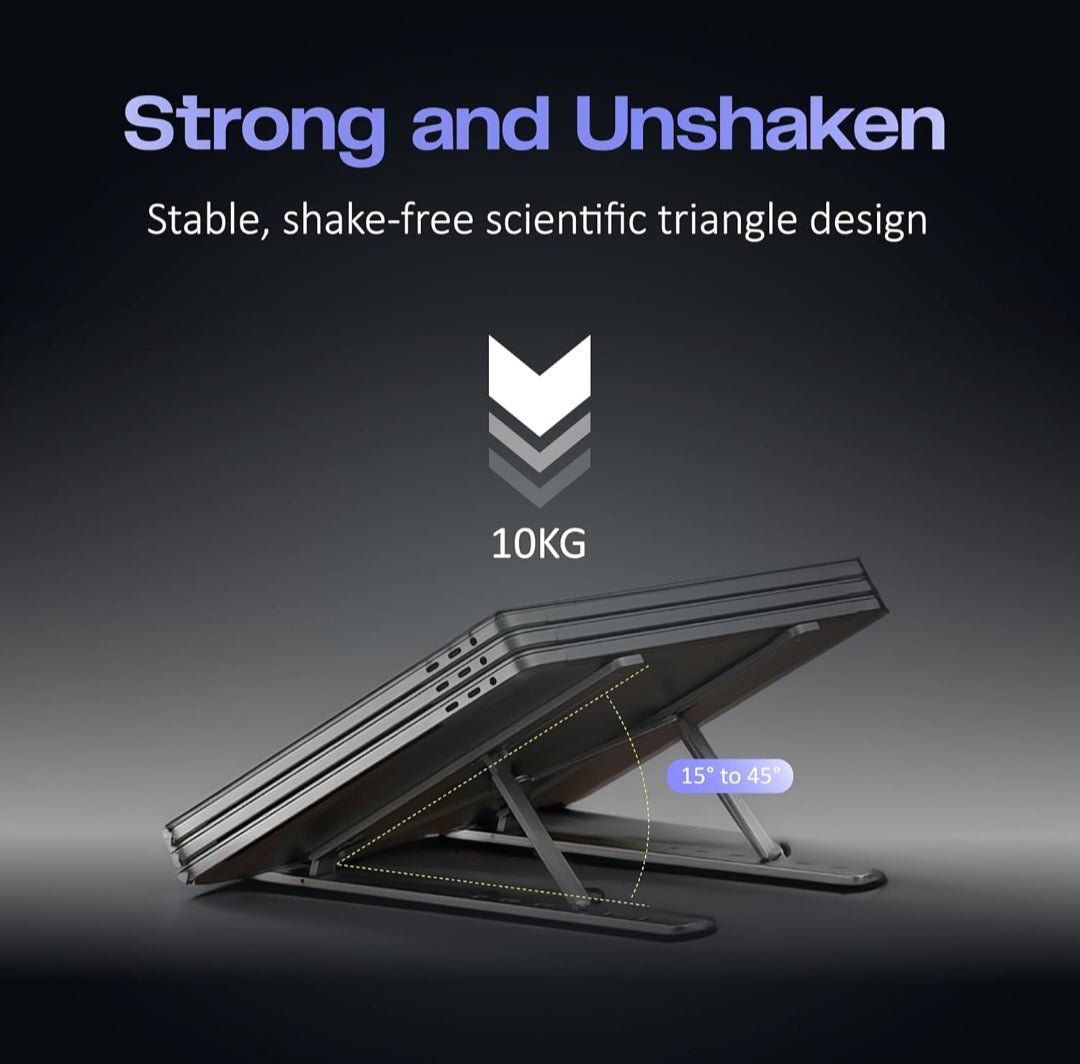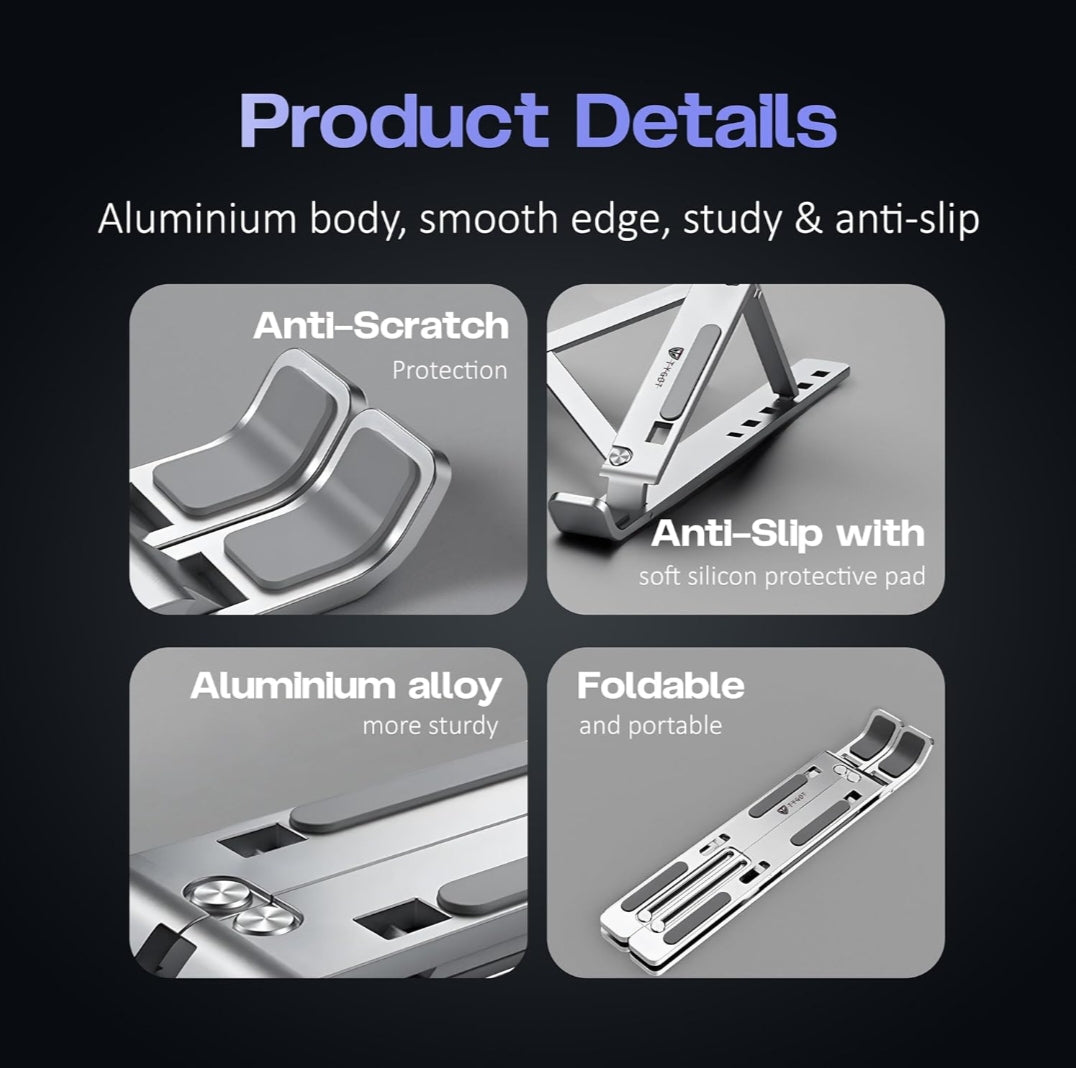 Crafted with premium-grade aluminium, this stand ensures strong support and stability for your laptop. It folds flat and fits easily into the included pouch — making it perfect for both work-from-home and travel.