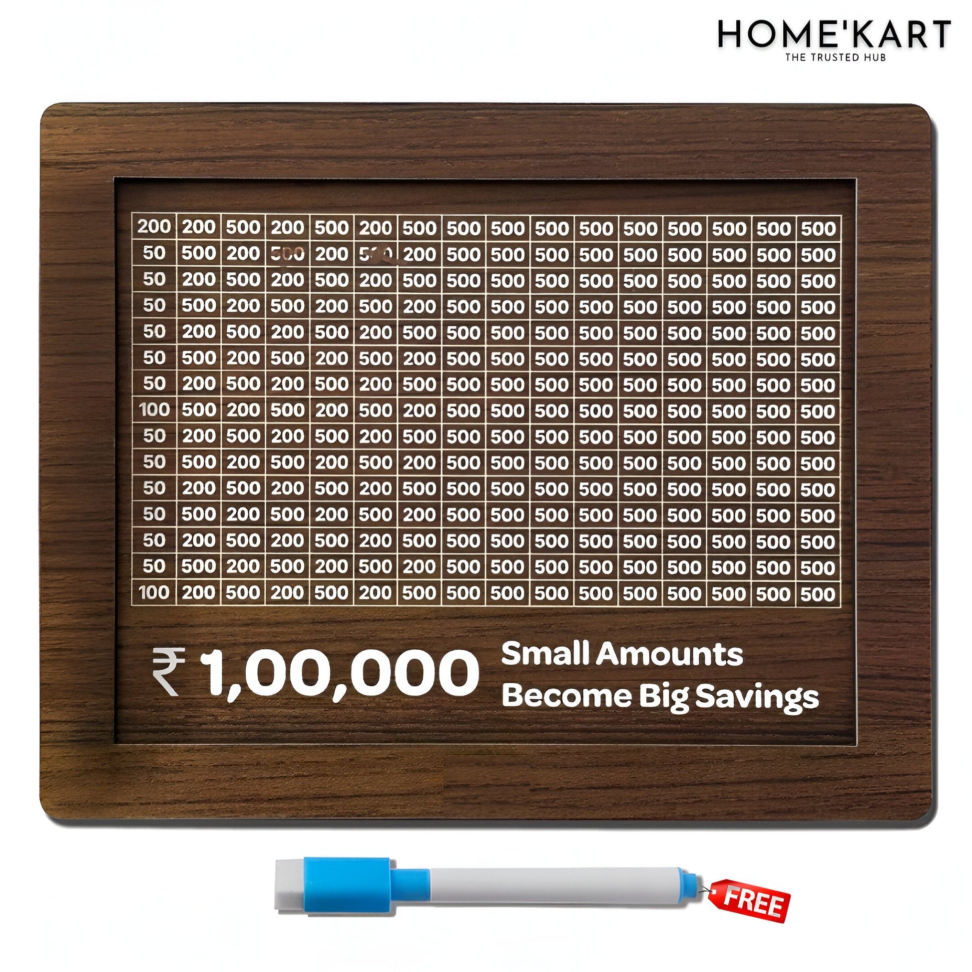 The front of the box features a well-organized grid, guiding you to save in small, manageable amounts. By following this plan, you can effortlessly accumulate ₹1,00,000 over time without feeling the burden of large savings at once.
